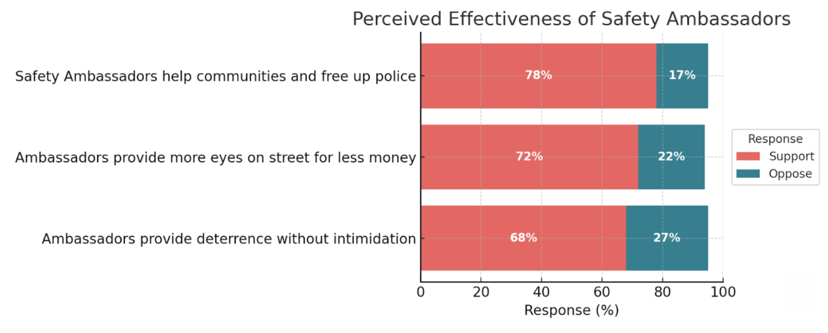 Related: To gauge public support for Safety Ambassador teams as part of a city’s public safety infrastructure, Safer Cities recently conducted a national survey of 2,503 registered voters and found that 78% of voters say Safety Ambassadors serve an “important” public safety function, allowing law enforcement to focus on serious crimes (full language of messages here).
