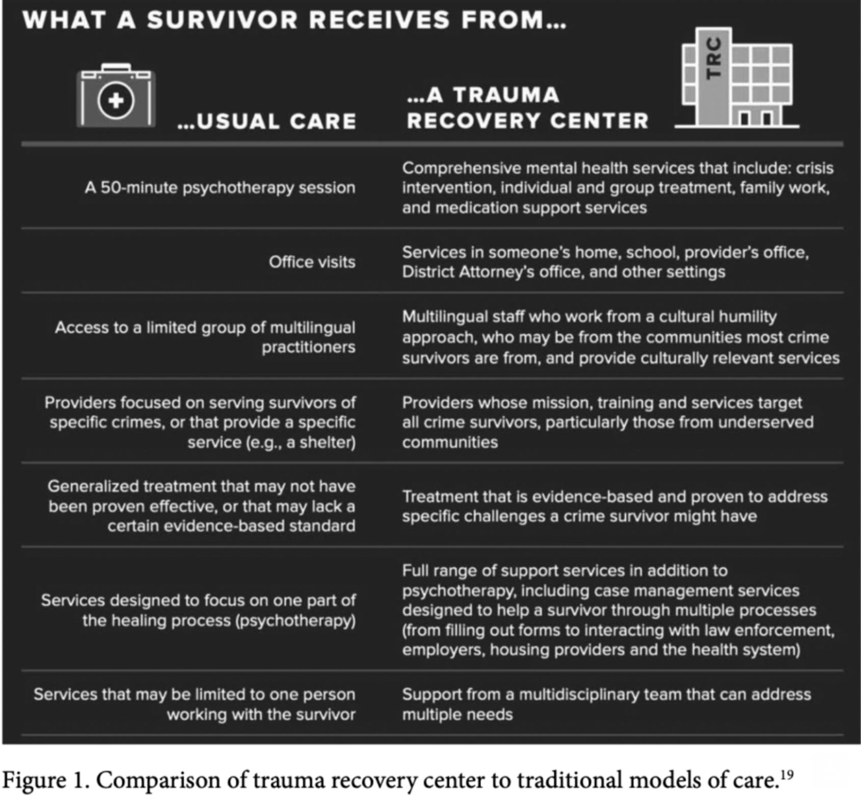 The study also includes a handy infographic about the difference in services from a traditional model versus a Trauma Recovery Center: