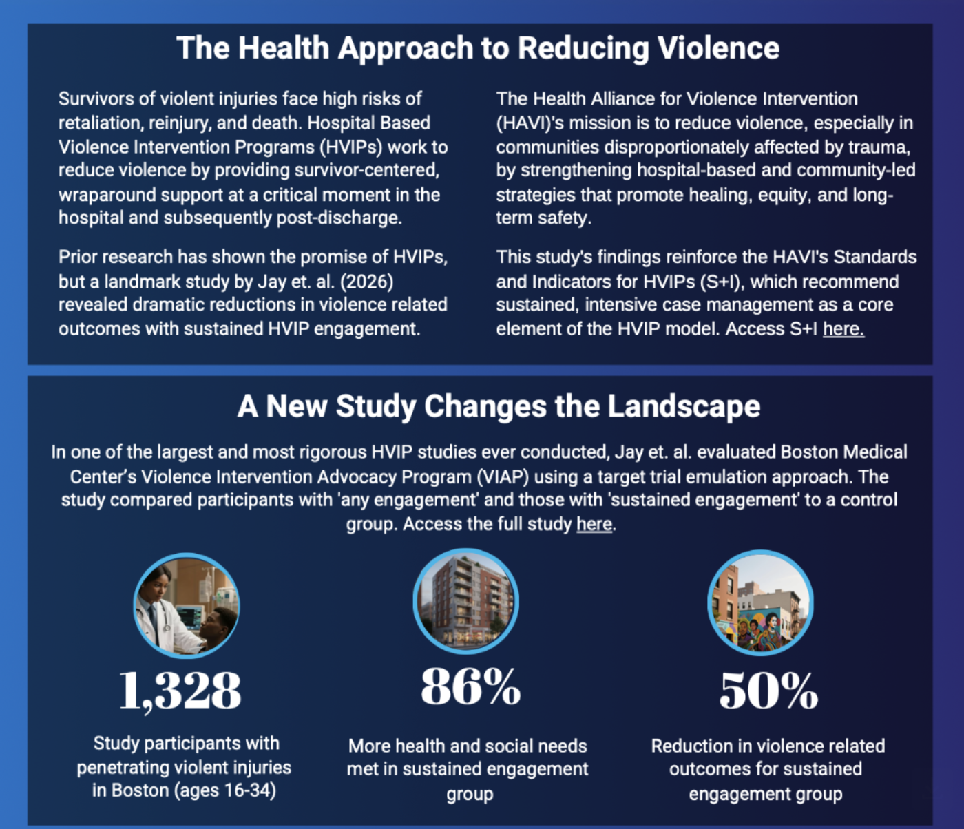 “For survivors of gunshot and knife wounds treated in the emergency department, VIAP provides post-discharge help with mental health and family support services and assistance, if necessary, with connections to housing, food, employment, education, and other needs….