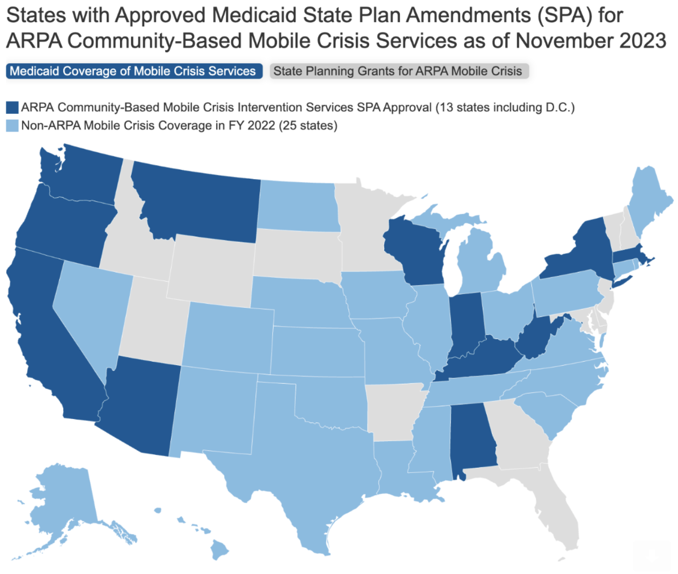 Safer Cities reported in late 2022 that Oregon had become the first state in the country to receive federal approval to obtain Medicaid reimbursement for mobile crisis response services. Today, according to the Kaiser Family Foundation, a dozen additional states are approved to seek reimbursement. The following KFF graphic illustrates the progress: