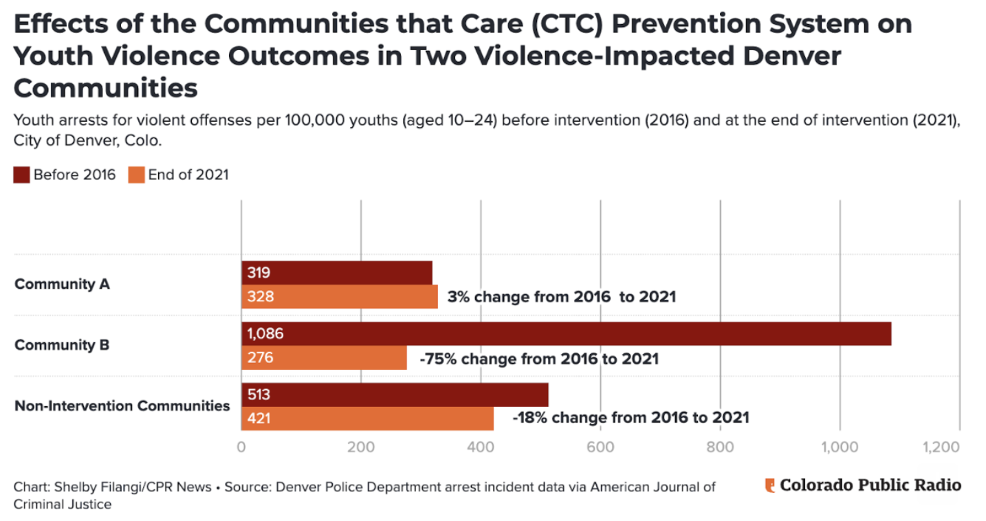In One Denver Neighborhood, CVI Program Helped Fuel A “75 Percent Decrease In Youth Arrests For Violence.” For Colorado Public Radio, Kiara DeMare and Arlo Pérez Esquivel report on a CVI program in the Park Hill neighborhood of Denver, where “a decade ago, youth arrests for violent offenses were high compared to the national average,” but saw “a 75 percent decrease in youth arrests for violence” from 2016 to 2021, when the CVI program was operational in the neighborhood. The CVI program was multi-faceted, the news station notes, it focused on both a concerted effort to “connect teens to their neighborhood… [forging a feeling of being] bonded to your community [which] can be a protective factor” and a partnership with “doctors and other medical staff serving the neighborhood to start using a standardized screening tool to identify the youth most at risk of violence.”